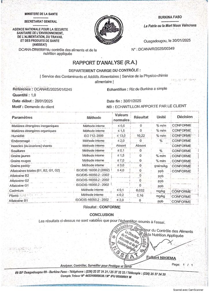 Le riz du Burkina de chez CLA Industrie a été analysé par l’Agence Nationale pour la Sécurité Sanitaire de l’Environnement, de l’Alimentation, du Travail et des produits de santé (ANSEAT), le résultat obtenu est : « CONFORME ».